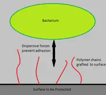 Dispersion forces between the polymer chains and the bacterial cells prevent bacteria from binding to the surface and initiating biofilm growth. The concept is similar to that of steric stabilization of colloids. Polymer chains are grafting to a surface via covalent bonding or adsorption. The solubility of these polymers stems from the high conformational entropy of polymer chains in solution. The Χ (Chi) parameter is used to determine whether a polymer will be soluble in a given solution. Χ is given by the equation: