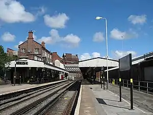 The station is staffed, during all opening hours, and has platform CCTV.[1] There are toilets, several payphones, a vending machine, booking office and live departure and arrival screens, on the platform, for passenger information. Each platform has a waiting shelter, as well as sheltered seating. The station does not have a car park, but does have a secure cycle locker with 28 spaces.[2] Access to the station is by ramp, and there is step-free access to the platforms, for wheelchairs and prams, via the lifts.[3] The station also has a snack bar, in the main booking hall.