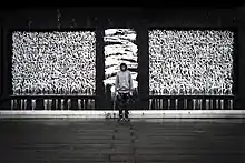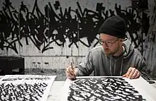 Bisco Smith is a New York-based contemporary artist with roots in music and graffiti. Bisco works in a variety of formats, including canvas and large outdoor murals, and is recognized for his lyrical approach to deconstructed expressionism characterized by gestural marks and abstracted text that embody the energy of a moment. Using music as his muse, he approaches each canvas as unique opportunity to channel the expression of his inspiration by stripping his compositions to their fundamental essence of motion and rhythm.[1] Bisco's works, painted predominantly in black and white, embody the creative spontaneity that exists at the intersection of music and paint.[2]