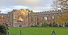 To the right of the building is an aisless chapel in the early Decorated Gothic style of the late 13th century, built of local stone with Doulting Stone dressings.[46] The remains of the 13th century great hall are the north wall and some column bases of an internal arcade, indicating that it was a five bayed aisled hall with crenellations and tall windows in the Decorated Gothic style.[3]