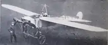The Blériot XI, largely designed by Raymond Saulnier,[2] was a development of the Blériot VIII, which Blériot had flown successfully in 1908. Like its predecessor, it was a tractor-configuration monoplane with a partially covered box-girder fuselage built from ash with wire cross bracing. The principal difference was the use of wing warping for lateral control. The tail surfaces consisted of a small balanced all-moving rudder mounted on the rearmost vertical member of the fuselage and a horizontal tailplane mounted under the lower longerons. This had elevator surfaces making up the outermost part of the fixed horizontal surface; these "tip elevators" were linked by a torque tube running through the inner section. The bracing and warping wires were attached to a dorsal, five-component "house-roof" shaped cabane consisting of a pair of inverted V struts with their apices connected by a longitudinal tube, and an inverted four-sided pyramidal ventral cabane, also of steel tubing, below. When first built it had a wingspan of 7 m (23 ft) and a small teardrop-shaped fin mounted on the cabane,[3] which was later removed.