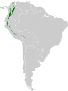 It is found in Bolivia, Colombia, Ecuador, Peru, and Venezuela. Its natural habitat is subtropical or tropical moist montane forests.