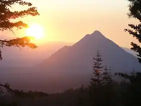 Black Butte (formerly Wintoon Butte, Cone Mountain, Sugar Loaf and Muir's Peak[5]) is a cluster of overlapping dacite lava domes in a butte,[2] a satellite cone of Mount Shasta.[6] It is located directly adjacent to the northbound lanes of Interstate 5 at milepost 742 between the cities of Mount Shasta and Weed, California. The I-5 freeway crosses a 3,912 ft (1,192 m) pass, Black Butte Summit, at the western base of the lava domes. The lava domes were extruded at the foot of the cone of Shastina following the period of its major eruptions about 9,000–10,000 years ago.[2]