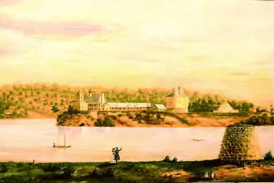 Fort Armstrong was located on Rock Island, which is now known as Arsenal Island. The view is from the Illinois side, with Iowa in the background.