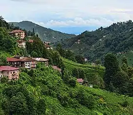 The Black Sea Region is a coastal strip of land 20–60 kilometres (12–37 mi) wide that runs along the coasts of Romania, Bulgaria, and a broader coastal strip in northern Turkey and Georgia. The coastline has rocky bays and sea cliffs, but is dominated by long stretches of low sand dunes and beaches sloping into the Black Sea.[1]