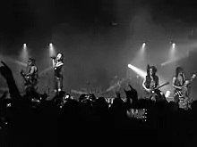 Black Veil Brides' music has been categorized under multiple genres of rock music including heavy metal,[111][112] glam metal,[113][114][115] gothic metal,[111][116][117] gothic rock,[118][119] metalcore,[115][120][121] emo,[120][122] post-hardcore,[120] hard rock[123] and shock rock.[124] The band's influences include Marilyn Manson,[125] Kiss, Metallica,[126] Pantera,[126] Avenged Sevenfold, Mötley Crüe,[127] Poison, AFI, W.A.S.P., Rob Zombie,[119] L.A. Guns, Aerosmith, Misfits, Dead Boys, The Damned, Slipknot, Dropkick Murphys, David Bowie, Queen,[128] Twisted Sister, Def Leppard, Skid Row, Social Distortion, Rise Against,[129] Billy Idol, Alice Cooper and Hot Water Music.[127][130][131] In an interview Christian Coma cited his greatest musical influences as Pendulum, Deadmau5, As I Lay Dying, In Flames, and Rise Against[129] while also adding that former Slipknot drummer Joey Jordison influenced his style of playing.[132]