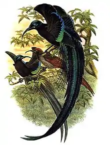 The black sicklebill (Epimachus fastosus) is a large member of the birds of paradise family, Paradisaeidae. This species is found throughout most of central New Guinea and the Vogelkop region to the northwest in montane forests at altitudes from 1,800 to 2,150 m (5,900 to 7,100 ft).