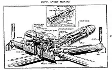 Given these shortcomings, those modern weapons that were available were allocated to the British Army, and the Home Guard was forced to supplement the meagre amount of outdated weapons and ammunition they had with ad hoc weapons.[6] One of these was the Blacker Bombard, designed by Lieutenant Colonel Stewart Blacker, the origins of which went back to the 1930s.[7] During the early part of the 1930s, Blacker became interested in the concept of the spigot mortar. Unlike conventional mortars the spigot mortar did not possess a barrel, and instead there was a steel rod known as a 'spigot' fixed to a baseplate; the bomb itself had a propellant charge inside its tail. When the mortar was to be fired, the bomb was pushed down onto the spigot, which exploded the propellant charge and blew the bomb into the air.[7]