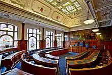 The building was commissioned to replace an 18th-century town hall located just to the south of the current structure close to the old St John's Market.[2] The new building, which was designed by Potts, Son and Hennings in the Jacobean style, was built on Talbot Square and completed in 1900.[1] The design involved a symmetrical main frontage with seven bays facing onto the Talbot Square with the outer bays curving round to the sides; the central bay featured a five-stage square clock tower with the ground floor forming a portico with Tuscan order pilasters and first floor forming a portico with Ionic order columns with a segmental pediment and a balustrade above.[1] The ship's bell from HMS Foudroyant, which was wrecked on Blackpool Sands in 1897, was recovered and placed in the town hall, when it opened.[3] The murals in the council chamber, which were painted by J. R. Brown in 1901, were intended to portray, firstly, the marriage of King Henry VII (of Lancaster) to Princess Elizabeth (of York) in 1486,[4] secondly, the surrender of the Jacobite rebels at Battle of Preston in 1715,[5] and thirdly, the last charge of King Richard III at Bosworth Field in 1485.[6][7]