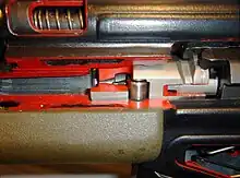 An unusual operation that uses a bolt head that moves rearwards when firing that allows the cartridge to move backwards or even stretching it until the bolt unlocks.[67][68] When firing the cartridge moves the bolt head rearwards around 2.5mm until it stops, then rotates the bolt to unlock and cycle the operation.