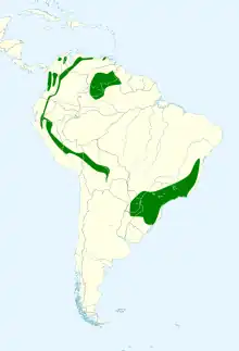 Its distribution is highly disjunct, with population associated with the Atlantic Forest in south-eastern Brazil, eastern Paraguay and north-eastern Argentina, the Andes from Bolivia in south to Venezuela in north, the Perijá and Santa Marta Mountains, the Venezuelan Coastal Range, and the Tepuis. All populations are associated with humid forest, but locally it also occurs in nearby gardens and parks (especially in the Atlantic Forest region). Most populations are found in subtropical highlands, but it occurs down to near sea level in the Atlantic Forest region.