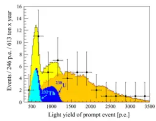 As seen from the neutrino spectrum, the blue peaks represent those antineutrinos that come from the Earth's interior. It is seen that only two peaks appear which correspond to 238U (second small peak) and 232Th (first large peak) and there is no presence of antineutrinos that originate from the beta decay of 40K. This is due to the energy threshold of the Borexino detector which is 1.806 MeV, being too high to trigger detection of those antineutrinos produced by the decay of 40K at 1.32 MeV.[1][38] From this graph, it is also possible to determine the abundances of each element present in the crust by simply extrapolating how many events occur at which energies. Based on the data in this case, it was possible to determine the flux of antineutrinos from 238U and 232Th as and respectively.[38]