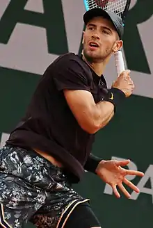 At the Madrid Open, he lost in the final round of qualifying to Mikhail Kukushkin. However, due to the withdrawal of Richard Gasquet, he earned a lucky loser spot in the main draw. He defeated Mischa Zverev and qualifier Pierre-Hugues Herbert to reach the third round. On May 12, he stunned world No. 1, Andy Murray to reach his first Masters quarterfinal on clay.[48] This was his first victory over a world No. 1 player. He ended up losing in the quarterfinals to eighth seed, world No. 9, and eventual finalist, Dominic Thiem.[49] Seeded seventh at the first edition of the Lyon Open, he was beaten in the first round by Nikoloz Basilashvili.[50] Ranked No. 40 at the French Open, he lost in the second round to 25th seed and world No. 26, Steve Johnson, in four sets.[51]