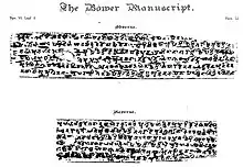 The Bower Manuscript is a collection of seven fragmentary Buddhist Hybrid Sanskrit[1] treatises found buried in a Buddhist memorial stupa near Kucha, northwestern China.[2][3] Written in early Gupta script[4] (late Brahmi script[1]) on birch bark, it is variously dated in 5th to early 6th century.[5][6] The Bower manuscript includes the oldest dated fragments of an Indian medical text, the Navanitaka.[2][7]