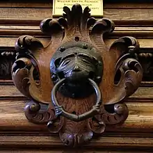 The original door knocker, now hanging in the college's dining hall. (A copy is on a door in Stamford School.)