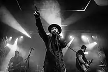In 2014, Green left the band due to ill health and Leadbeater announced he would be leaving to tour with Joanne Shaw Taylor for 12 months. In 2015, Whiteley was replaced by Jonathan Armstrong on bass, Green was replaced by Karl Woolston, Leadbeater was replaced by Jack Manning (keyboards and guitars) and Whitton (temporarily) by Stefan Drapan. In the same year, the band's name was changed to Bravado Cartel.[7] In the years 2016, 2017 and 2018 the band toured the US,[8] performing in Hard Rock Cafés in Boston and New York, conducting radio shows and playing at New York's oldest rock club, The Bitter End (2018).[9][10] The first tour was set up by Bruce Replogle, ex-publicist of John Lennon on Double Fantasy.[11] Jonny Green returned to the band as guitarist in 2017.
