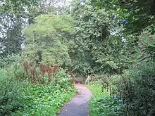 The River Brent runs along the western edge, and there are three ponds next to the river. These are the remains of a lake built possibly as long as a thousand years ago by the abbots of Westminster as a duck decoy.[1] Tufted ducks, mallards, coots and moorhens still nest on a wooded island on one of the ponds.[2]