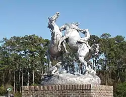 About 1,445 works of American figurative sculpture are displayed at the Archer and Anna Hyatt Huntington Sculpture Garden. Many of the works are by Hyatt Huntington, but other artists are also featured. Walkways and garden paths link the sculptures in their distinctive garden, fountain, or landscape settings, with vistas of the scenery surrounding them. A 1,600-acre (650 ha) area of Brookgreen Gardens was listed on the National Register of Historic Places in 1978.[2] The sculpture garden portion, 551 acres (223 ha), of Brookgreen Gardens was included in the designation of Atalaya and Brookgreen Gardens as a National Historic Landmark in 1984.[5][6] Atalaya Castle is just across U.S. 17, which cuts through the former combined Huntington property. A seventy-inch long sea horse, sculpted by Joseph Kiselewski,[7] was place in Brookgreen Gardens in 1942.
