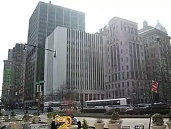 Brooklyn Law School's main building at 250 Joralemon Street, Brooklyn, New York. The 1994 new classical Fell Hall tower by architect Robert A. M. Stern to the right.