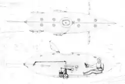 The submarine was 10 feet, 6 inches long by 27 inches high by 25 inches wide and displaced about six tons when submerged.[1] She was equipped with eight dead-lights on top to provide interior light, and a top hatch with a retractable conning tower for surface navigation. For propulsion, she had three sets of duck-foot paddles and a large rudder. She was also equipped with hatches with leather seals in order to make possible some manipulations outside the hull, a small ballast system with a lever and piston, and a 50 lb anchor. The ship had a complement of three men.
