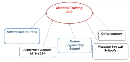 The unit which remained in Ruse was renamed Miner and Stoker School (Miner school with stoker training) with duration of training of four years, including practical training, with the first two-year of training recognized as compulsory military service for the students. The Miner and Stoker School was temporarily closed down in 1909. In 1912, due to the fleet's increased need of technical specialists, it was reopened under the name Maritime Special Schools, which in turn were subordinate to the newly formed structure in Varna called Training Unit (later renamed Maritime Training Unit). The schools were established in 1912. In 1913 they admitted the first class of 34 cadets. Originally, the Maritime Special Schools consisted of three units: mining and electrical engineering, stoker and steersman. During World War I, the Diver School and Radiotelegraphy School were formed and briefly functioned. The duration of training in the schools was four years. They can be seen as the prototype of the present-day Postgraduate Studies Department and Professional Sergeant College within the Nikola Vaptsarov Naval Academy.