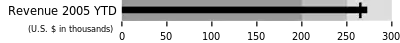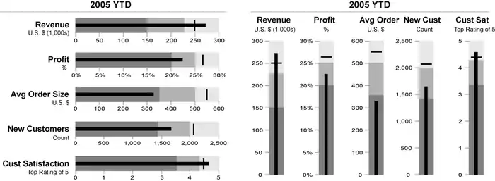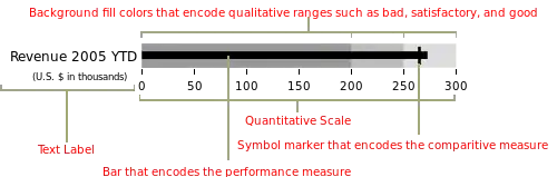 A bullet graph is a variation of a bar graph developed by Stephen Few. Seemingly inspired by the traditional thermometer charts and progress bars found in many dashboards, the bullet graph serves as a replacement for dashboard gauges and meters. Bullet graphs were developed to overcome the fundamental issues of gauges and meters: they typically display too little information, require too much space, and are cluttered with useless and distracting decorations. The bullet graph features a single, primary measure (for example, current year-to-date revenue), compares that measure to one or more other measures to enrich its meaning (for example, compared to a target), and displays it in the context of qualitative ranges of performance, such as poor, satisfactory, and good. The qualitative ranges are displayed as varying intensities of a single hue to make them discernible by those who are color blind and to restrict the use of colors on the dashboard to a minimum.