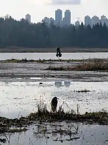 Burnaby Lake hosts over 400 varieties of plant, bird, fish, mammal, reptile and amphibian species.[4] An exceptionally wide variety of birds frequent the area, including great blue herons, bald eagles, osprey, and the green heron.[2] Black bears once were common in the area.[5] Vegetation such as bladderworts, cattails, bulrushes, and sedges are common around the area, with deciduous trees around the edge of the marshes. Conifers occupy the areas furthest from the lake.[1]
