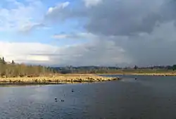 ![]() The eastern half of the lake on a cloudy day with the Lougheed Town Centre in the distance | |