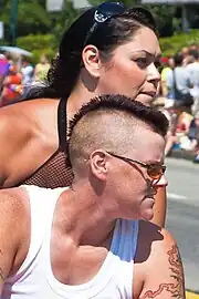In the mid 20th century, butch people were usually limited to a few jobs, such as factory work and cab driving, that had no dress codes for women.[9] During the 1950s with the anti-gay politics of the McCarthy era, there was an increase in violent attacks on gay and bisexual women, while at the same time the increasingly strong and defiant bar culture became more willing to respond with force. Although femmes also fought back, it became primarily the role of butches to defend against attacks and hold the bars as gay women's space.[10] The prevailing butch image was severe but gentle, while it became increasingly tough and aggressive as violent confrontation became a fact of life.[11] Leslie Feinberg's novel Stone Butch Blues is a predominant piece of butch literature, and offers a window into butch bar culture, police brutality towards transvestites (both drag queens and butch people), and butch eroticism in the 1970s.[12]