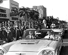 Bryant entered the governorship in January 1961, only two years after Fidel Castro's revolutionary forces came to power in Cuba. An ardent opponent of Communism and the Soviet Union since his early days in the legislature, Bryant favored a firm national policy against the Soviet-supported Castro government and pushed to implement civil defense measures in case of war between Soviet Union and the United States.[31] As evidence of Soviet military aid to Cuba grew, Governor Bryant called for the United States to do whatever was necessary to end the Castro regime. A month before the Cuban Missile Crisis, he spoke about his support for a military blockade of Cuba and even an invasion of the island.[32] The governor believed that only the downfall of the Cuban government would end the flow of Cuban refugees to Florida—a situation that he constantly asked the Kennedy administration to relieve. At the same time, he worried about the economic impact the Cuban crisis was having on Florida, especially in south Florida in the days following the Cuban Missile Crisis, when he tried to assure Americans and the world that Florida was safe for tourists.[33] During the missile crisis, he fully backed President Kennedy's actions towards Cuba and the Soviet missiles; however, in private, he urged the president to invade Cuba and end the Castro regime.[34] Governor Bryant called out the Florida National Guard, including its air arm, to back up the US military presence in Florida, addressed Floridians about the crisis on the radio, and rushed to strengthen civil defense measures. Bryant remained a Cold warrior after the missile crisis, supporting the Johnson and Nixon policies in Vietnam and endorsing an aggressive stand against Communism wherever it was in power. He supported the requirement that all Florida high school students had to pass a course in Americanism versus Communism before graduation. In 1963, Bryant created the Florida Center for Cold War Education, an institute designed to promote patriotism and to educate Floridians on the threats posed by Communist ideas and countries.[35]