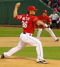 In 2011, Wilson was 16–7 with a 2.94 ERA (seventh in the AL).[7] He led the league in games started (34), and was fourth in wins, fifth in win–loss percentage (.696), and sixth in strikeouts (206; sixth-most in Rangers history).[7][9]