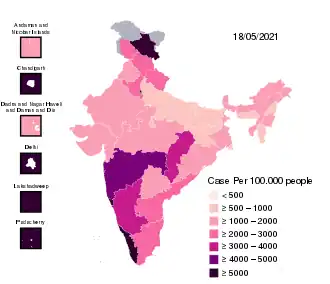 ![]() COVID-19 cases per 100,000 people by state, as of 18 May 2021