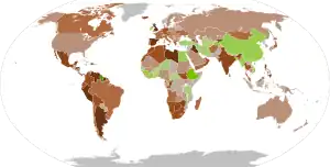 Map showing real GDP growth rates in 2020, recorded by the International Monetary Fund as of 26 January 2021; countries in brown are those that have faced a recession.