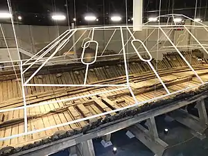 After nearly a century, the remaining lower hull of the ironclad was discovered and then raised in 1963; approximately 15,000 shipboard artifacts were recovered and carefully cataloged. Neuse's hull was then temporarily installed in the Governor Caswell Memorial, beside the river, in Kinston.[2][3] Since 2013, Neuse and her artifacts have been on display in a new, climate-controlled building in downtown Kinston.[4][5][6]