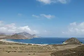 The pueblo of Rodalquilar sits in the middle of the Parque Natural de Cabo de Gata. There are several art galleries featuring painting, photography, pottery, and ceramics. Rodalaquilar is known in the province of Almería for ancient gold mines.[10] One of the more popular beaches near Rodalquilar is Playa el Playazo. This beach is 400 meters long and 30 meters wide, and its sand is golden and fine.[14] In common with many of the beaches in the middle and toward the western end of the natural park, the sea offers good visibility for snorkelling or diving.. El Playazo is encircled by a mountain and Saint Ramon's Castle. This Castle was built in the 18th century so that the coast of Almería could defend itself from sea attacks.[15]