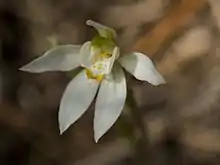 Caladenia aurantiaca, commonly known as orangetip fingers, is a plant in the orchid family Orchidaceae and is endemic to Victoria, although it is also found on one Bass Strait island. It is a slender ground orchid with a single hairy leaf and one or two short-lived, orange-tipped, white flowers on a thin, wiry spike.