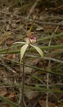 The flowers are about 7 cm (3 in) wide. The dorsal sepal is lance-shaped near the base and 5–7.5 cm (2–3 in) long, 3–4 mm (0.1–0.2 in) wide near the base but narrows to a thread-like tip covered with many black glands. The lateral sepals are linear to lance-shaped, 5–6.5 cm (2–3 in) long, 3.5–6.5 mm (0.1–0.3 in) wide but narrow to a tip similar to that on the dorsal sepal. The petals are similar to the lateral sepals but slightly shorter and narrower. The labellum is whitish or pinkish, sometimes with red markings and is 14–16 mm (0.55–0.63 in) long, 8–10 mm (0.3–0.4 in) wide with erect lateral lobes. There are seven to nine calli about 2 mm (0.08 in) on the sides of the lobes and many short, white-tipped calli along the centre of the labellum. Flowering occurs in August and September.[2][3]