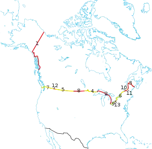 The length of the terrestrial boundary is 8,891 km (5,525 mi), of which 6,416 km (3,987 mi) is against the contiguous 48 states, and 2,475 km (1,538 mi) against Alaska.[56] Eight out of thirteen provinces and territories of Canada and thirteen out of fifty U.S. states are located along this international boundary.