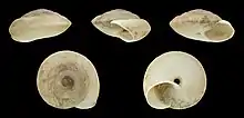 The aperture is semi-rotundate, oblique, margins approaching, united by a thin callus on the parietal wall. The peristome is scarcely thickened, reflexed, whitish, upper margin slightly curved, basal rounded, columellar ascending, and slightly dilated. Umbilicus moderately wide and deep, showing a portion of the penultimate whorl.[2]