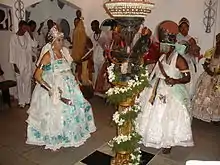 Music and dance is a fundamental element of Candomblé.[281] The drumming will often take place all night.[282] Participants are expected to wear white, with women wearing skirts.[282] Three main types of drum are employed, the largest being the rum, the middle-sized being the rumpi, and the smallest being the .[283] These drums are understood as living and need to be fed.[284] The head drummer is known as the alabê.[285] Many terreiros maintain that women should not be involved in this ritual drumming, although others reject this tradition.[261] In some rituals, practitioners will drink a concoction containing jurema, a mildly hallucinogenic plant, which is sometimes mixed with the blood of sacrificed animals.[286]