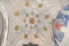 The interior ceiling is covered with a ribbed vault and golden rosettes, centred on the arms of House of Lancaster.[1][2] The high altar is covered in sculptures, located within niches on corbels with awnings. A rounded arch, with the arms of the founder, protect access to the main tomb. The walls are decorated in azulejo tile with figures from the creation of the world, while the pavement is covered in tomb slabs.[1][2]
