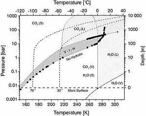 The hydrate structures are stable at different pressure-temperature conditions depending on the guest molecule. Here is given one Mars-related phase diagram of CO2 hydrate, combined with those of pure CO2 and water.[46] CO2 hydrate has two quadruple points: (I-Lw-H-V) (T = 273.1 K; p = 12.56 bar or 1.256 MPa) and (Lw-H-V-LHC) (T = 283.0 K; p = 44.99 bar or 4.499 MPa).[47] CO2 itself has a triple point at T = 216.58 K and p = 5.185 bar (518.5 kPa) and a critical point at T = 304.2 K and p = 73.858 bar (7.3858 MPa). The dark gray region (V-I-H) represents the conditions at which CO2 hydrate is stable together with gaseous CO2 and water ice (below 273.15 K). On the horizontal axes the temperature is given in kelvins and degrees Celsius (bottom and top respectively). On the vertical ones are given the pressure (left) and the estimated depth in the Martian regolith (right). The horizontal dashed line at zero depth represents the average Martian surface conditions. The two bent dashed lines show two theoretical Martian geotherms after Stewart & Nimmo (2002) at 30° and 70° latitude.[42]