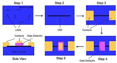 The earliest techniques for fabricating carbon nanotube (CNT) field-effect transistors involved pre-patterning parallel strips of metal across a silicon dioxide substrate, and then depositing the CNTs on top in a random pattern.[1][2] The semiconducting CNTs that happened to fall across two metal strips meet all the requirements necessary for a rudimentary field-effect transistor. One metal strip is the "source" contact while the other is the "drain" contact. The silicon oxide substrate can be used as the gate oxide and adding a metal contact on the back makes the semiconducting CNT gateable.