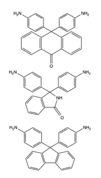 Cardo aromatic polyamides have amides incorporated into the backbone, separated by aromatic rings. The aromatic diamines have a low basicity that provides additional challenges to synthesis. Notably, they cannot be synthesized via melt polycondensation. The diamines are not polar enough to dissolve in water, making interfacial polycondensation methods challenging; there has been success from 4’,4” -diphenyl phthalide dicarboxylic chloride and aliphatic diamines as the two phases of the solutions in where the polycondensation can occur at their interface.[1] More commonly, these polymers are synthesized from low temperature solution polycondensation via a reaction with acid chlorides, producing hydrochloric acid as a byproduct. These reactions are done under basic conditions in aprotic solvents, often in the presence of an inorganic salt, such as calcium chloride, to increase solubility.[7]