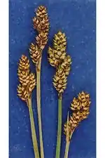 This sedge produces small clumps of short, grasslike stems 10 to 30 centimeters tall from a thin network of rhizomes. The thin, grayish to pale green leaves are up to about 15 centimeters in length but shorter than the stems. The inflorescence is a small, dense bundle of a few brown flower spikes. The fruit is coated in a dark colored perigynium.