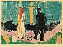 At the turn of the 20th century, Friedrich was rediscovered by the Norwegian art historian Andreas Aubert (1851–1913), whose writing initiated modern Friedrich scholarship,[16] and by the Symbolist painters, who valued his visionary and allegorical landscapes. The Norwegian Symbolist Edvard Munch (1863–1944) would have seen Friedrich's work during a visit to Berlin in the 1880s. Munch's 1899 print The Lonely Ones echoes Friedrich's Rückenfigur (back figure), although in Munch's work the focus has shifted away from the broad landscape and toward the sense of dislocation between the two melancholy figures in the foreground.[67]