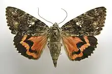 M. sponsa L. Somewhat smaller and paler than dilecta; generally with a pale fulvous tint below middle in the space between outer and submarginal lines; the lunule between veins 3 and 4 nearly always paler; the pale outline of the reniform stigma, the whitish spot preceding it, and the white spot beneath it often conspicuous; but both of these spots may be of the ground colour or yellowish, as well as white; hindwing with the inner margin not darkened; the red ground colour not so deep; — the form rejecta Fisch.-Wald. besides being smaller in point of size, has the hindwing clouded with fuscous in basal area; the median band thickened, and the red band following it much narrower than usual; the terminal border brownish black, and the red ground dull pink; to judge from the appearance only, this might well be a distinct species;- examples in which the median space between inner and outer lines is prominently paler grey than the other areas are separated by Spuler as ab. fasciata ; — in ab. desponsa Schultz the red of hindwing is either wholly yellow or partially changed to that colour; but examples of such change in this species are much rarer than in nupta and elocata. — in ab. florida Schultz, which must come very near to fasciata Spul., the median area and terminal area beyond subterminal line are whitish grey, while the basal area and space between outer line and subterminal are pale brown; — ab. grisea ab. nov. (a female of which is in the Tring Museum from Uralsk, sent by M. Bartel), is entirely dark grey grizzled with pale grey, without any brown or fulvous tints, the lines black; — subsp. laeta Oberth., from Algeria, is brighter than S. European examples, the median area at each end dusted with whitish, the subterminal line whitish, and the annulus of the reniform and the spots before and below it white. — Larva grey brown or red brown, finely dark dotted; dorsal tubercles reddish: the hump on segment 9 prominent, with an oval yellow transverse marking edged with black: the hump on segment 12 also strong, with the two hind tubercles on it developed into brown points; head grey with black streaks. [2]