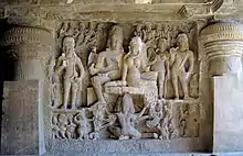 The Ellora Caves are located about 18 miles from the city of Aurangabad in the Chamadari Hills. Pre-historic paintings were engraved in five Ellora Caves. The Ellora paintings can be organized in two series. The first set of paintings depicts images of the goddess Lakshmi and Lord Vishnu and was developed while the caves were engraved. The second set of images focuses on images of Lord Shiva with his followers, Apsaras, etc. and was developed centuries after the formation of the caves.