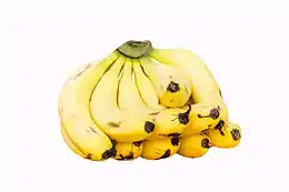 Cavendish cultivars are distinguished by the height of the plant and features of the fruits,[8][14] and different cultivars may be recognized as distinct by different authorities. The most important clones for fruit production include: 'Dwarf Cavendish', 'Grande Naine', 'Lacatan' (bungulan), 'Poyo', 'Valéry', and 'Williams' under one system of cultivar classification.[8] Another classification includes: 'Double', 'Dwarf Cavendish', 'Extra Dwarf Cavendish', 'Grande Naine', 'Pisang Masak Hijau' (syn 'Lacatan'), and 'Giant Cavendish' as a group of several difficult to distinguish cultivars (including 'Poyo', 'Robusta', 'Valéry', & 'Williams').[14] 'Grande Naine' is the most important clone in international trade, while 'Dwarf Cavendish' is the most widely grown clone.[14] 'Grande Naine' is also known as Chiquita banana.[15]