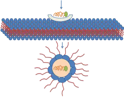 The third mechanism responsible for the translocation is based on the formation of the inverted micelles. Inverted micelles are aggregates of colloidal surfactants in which the polar groups are concentrated in the interior and the lipophilic groups extend outward into the solvent. According to this model, a penetratin dimer combines with the negatively charged phospholipids, thus generating the formation of an inverted micelle inside of the lipid bilayer. The structure of the inverted micelles permits the peptide to remain in a hydrophilic environment.[23][24] [25] Nonetheless, this mechanism is still a matter of discussion, because the distribution of the penetratin between the inner and outer membrane is non-symmetric. This non-symmetric distribution produces an electrical field that has been well established. Increasing the amount of peptide on the outer leaflets causes the electric field to reach a critical value that can generate an electroporation-like event.
